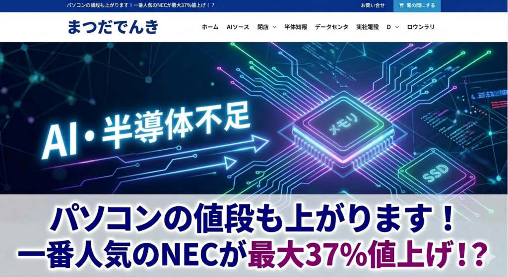 春モデルから大幅に値上げ 進学・転職の買い替えをご検討なら早めに!! こんにちは!まつだでんきです。 今日は、これからパソコンの買い替えを検討されている皆様へ、非常に重要なお知らせがあります。 ニュース等でも少しずつ話題になっていますが、2026... -